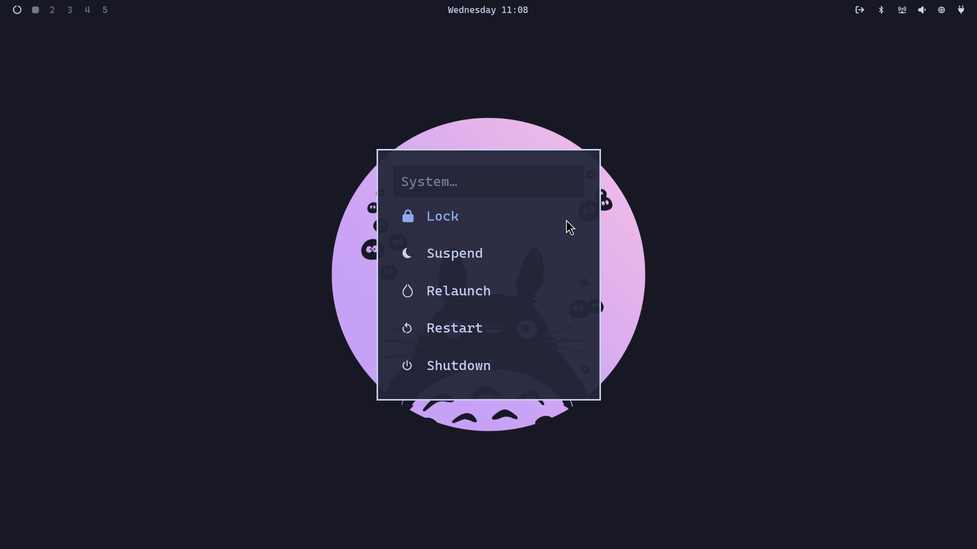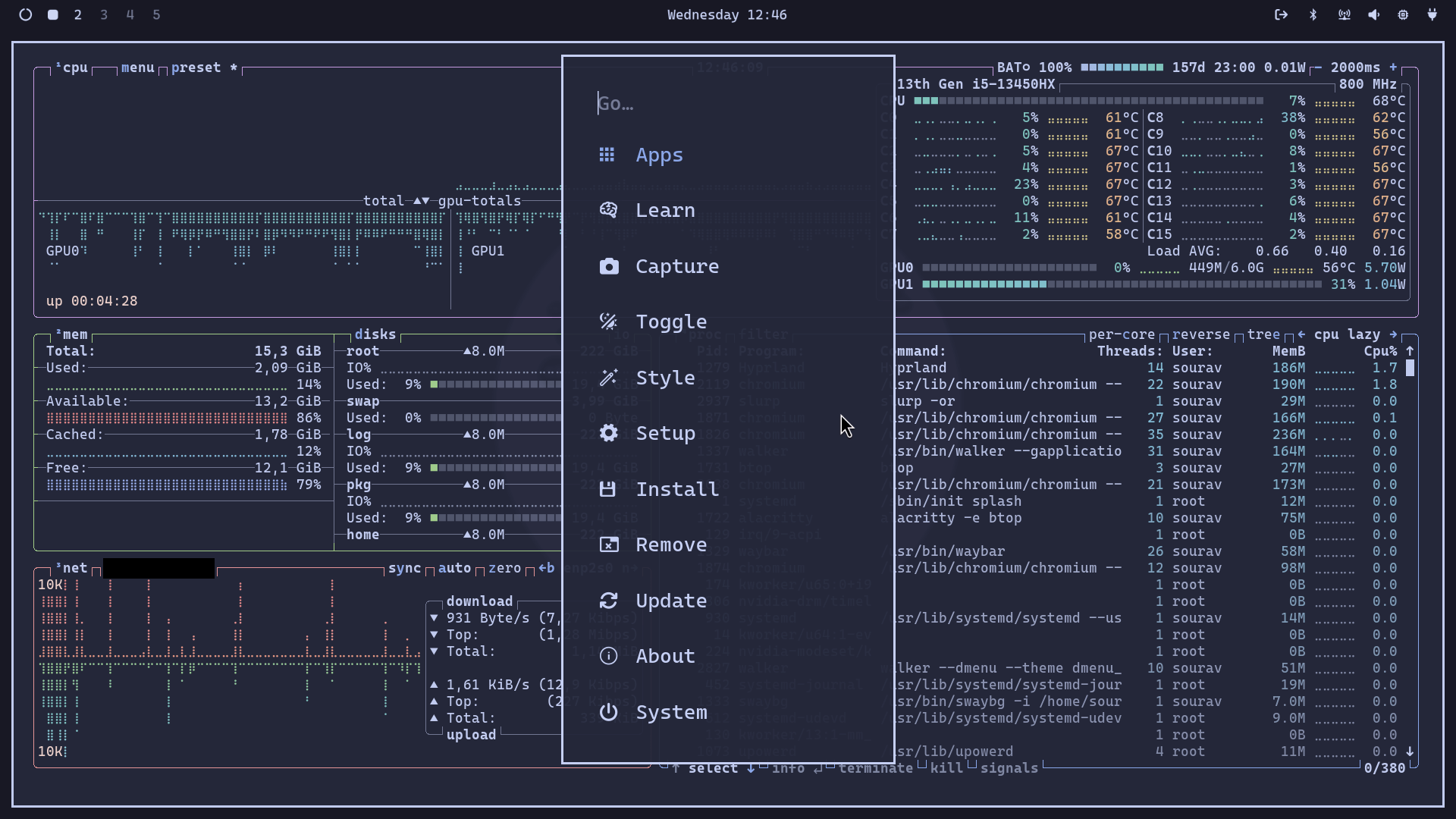 is really useful, giving quick access to important options. The top bar also features a chip-looking button that opens Btop++ for system monitoring and another button that lets you access the power menu to shut down, restart, or log out.
